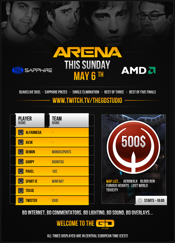 Сегодня пройдет 2-ой Quake Live турнир от The GD Studio. Участниками станут 8 приглашенных игроков, среди которых 2 российских представителя ( pavel и alfaomega). Система проведения: single elimination bo3, полуфинал и финал bo5. Призовой фонд такой же, какой и в прошлый раз, а именно 500 $.